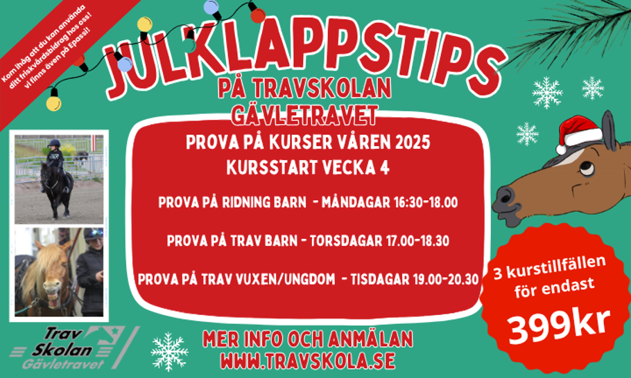 Kom till oss tre gånger och prova på hur det är att gå på travskolan och hur det är att köra en travhäst.