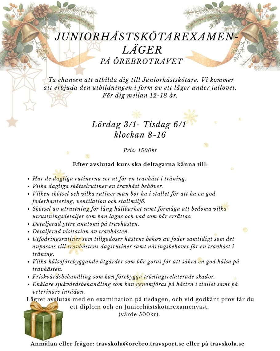 Vill du öka dina kunskaper i hur man är en bra hästskötare? Nu finns ett läger som passar dig mellan 12-18 år där man sista dagen gör en examination för att bli juniorhästskötare. En fin merit att ha om man tex vill söka sommarjobb i ett stall. Vi blandar körning med teori. Vill du anmäla dig eller veta mer? Maila Anna på travskola@orebro.travsport.se eller fråga oss i stallet.