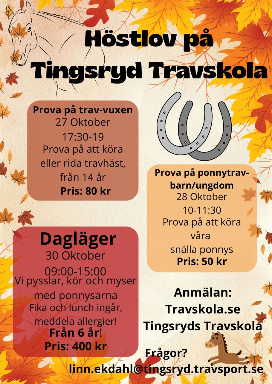 Funderingar? Kontakta travskolan på mail travskola@tingsryd.travsport.se eller till linn.ekdahl@tingsryd.travsport.se
