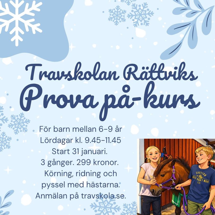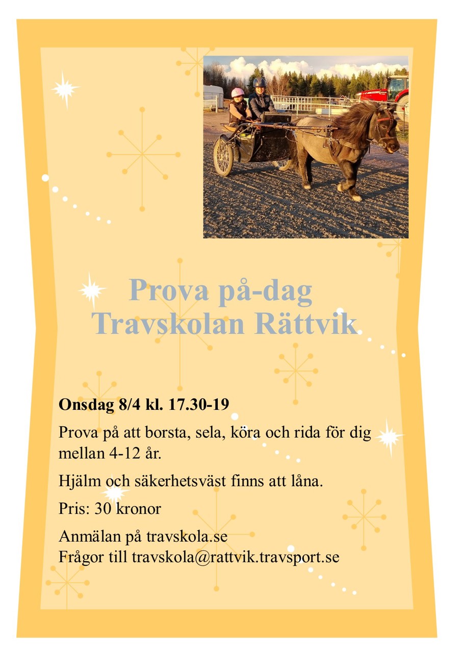 Prova på ger dig möjlighet att testa på sporten med antingen stor häst eller ponny. Oftast finns det möjlighet att fortsätta i travskolan på en utav terminskurserna som erbjuds.